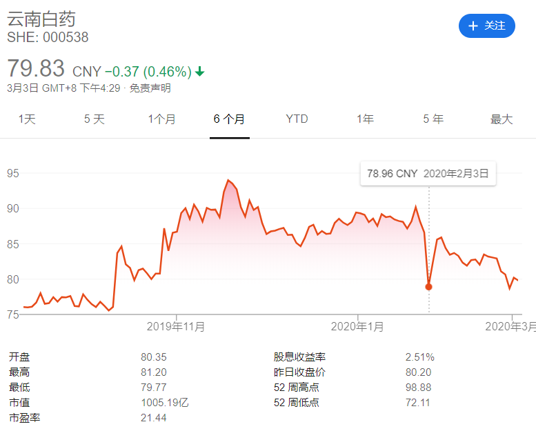 ▲云南白藥股價變動