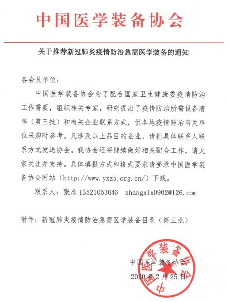 2020年2月26日,中國醫(yī)學(xué)裝備協(xié)會發(fā)布了《關(guān)于推薦新冠肺炎疫情防治急需醫(yī)學(xué)裝備的通知》,繼《新冠肺炎疫情防治急需醫(yī)學(xué)裝備目錄(第一批)》和《新冠肺炎疫情防治急需醫(yī)學(xué)裝備目錄(第二批)》目錄之后,公布了《新冠肺炎疫情防治急需醫(yī)學(xué)裝備目錄(第三批)》。