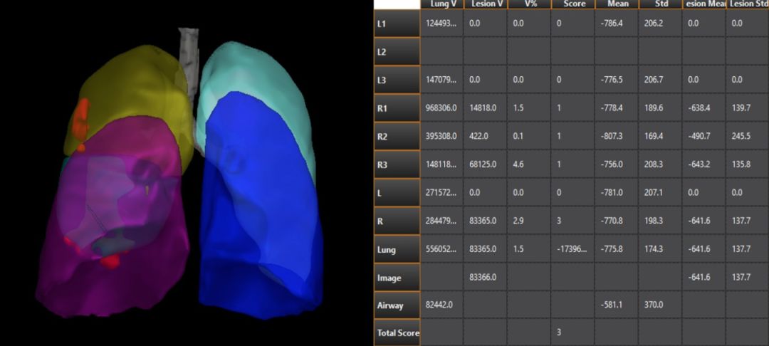 對于新冠中后期復雜病變,平臺可對肺葉進行快速智能化分割,精準定位病灶和定量評分;結合AI深度學習建模,進一步評估疾病進展、反映病變體積與分布,分析彌漫性病變,預測病情走勢。(圖中:3D顯示病灶(紅色區(qū)域)和病灶定量和評分分析) 。