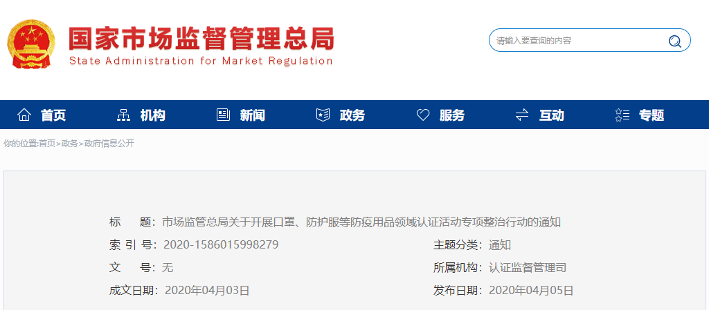 昨日(4月5日),國家市場監(jiān)管總局最新發(fā)布了《關(guān)于開展口罩、防護(hù)服等防疫用品領(lǐng)域認(rèn)證活動專項整治行動的通知》(以下簡稱《通知》)。