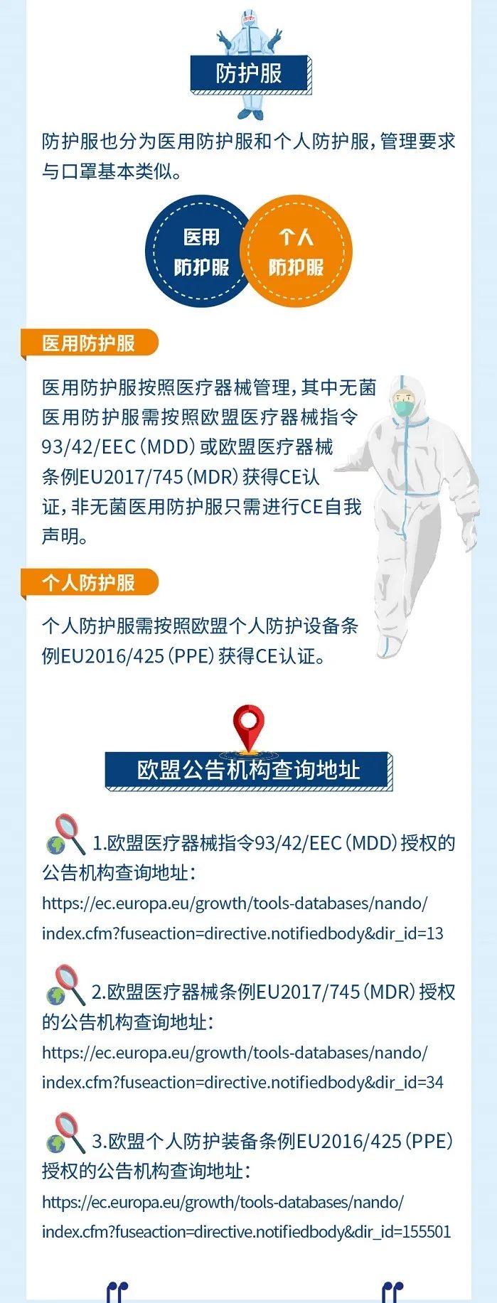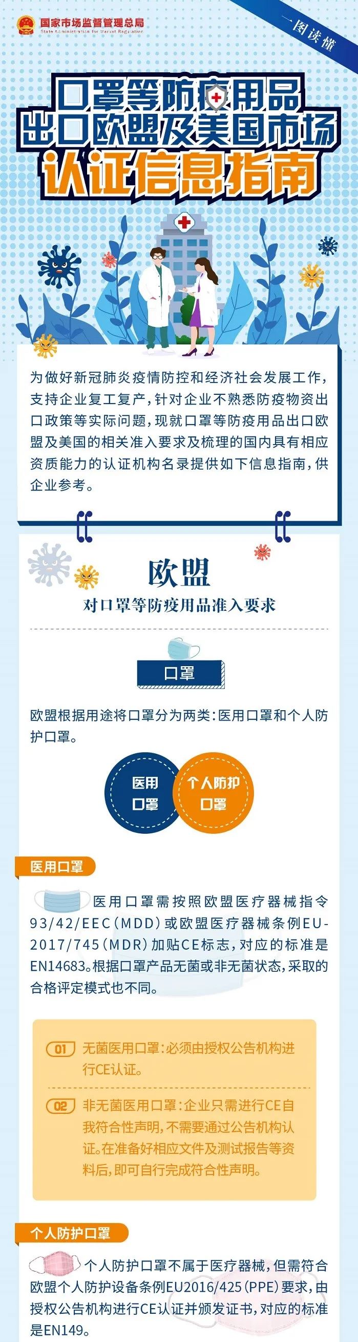 對于企業(yè)出口認(rèn)證的需求,經(jīng)過初步梳理,國家市場監(jiān)管總局編制出了一份口罩等防疫用品出口歐盟及美國市場認(rèn)證信息指南,供企業(yè)參考。