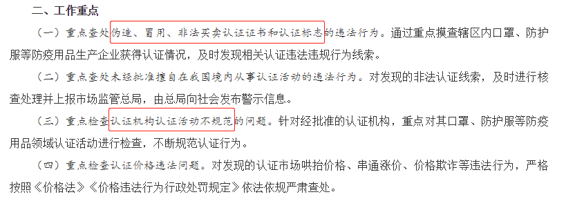 為了規(guī)范認(rèn)證市場秩序,即日起,市場監(jiān)管部門將在口罩、防護(hù)服等防疫用品領(lǐng)域開展認(rèn)證專項整治活動,重點打擊虛假認(rèn)證、買證賣證等認(rèn)證違法行為。