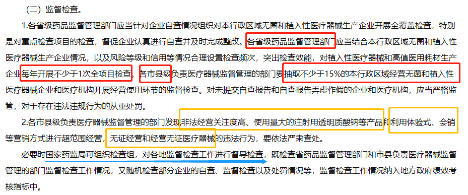 與最新醫(yī)療器械質(zhì)量抽檢辦法要求相同,本次對無菌和植入性醫(yī)療器械的檢查將分為企業(yè)自查和各部門監(jiān)督檢查同時進(jìn)行。6月底前,各醫(yī)械企業(yè)要全面完成自查。(企業(yè)自查要點見附件)