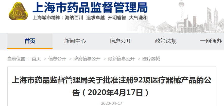4月17日,上海市藥品監(jiān)督管理局發(fā)布《關(guān)于批準(zhǔn)注冊(cè)92項(xiàng)醫(yī)療器械產(chǎn)品的公告》。