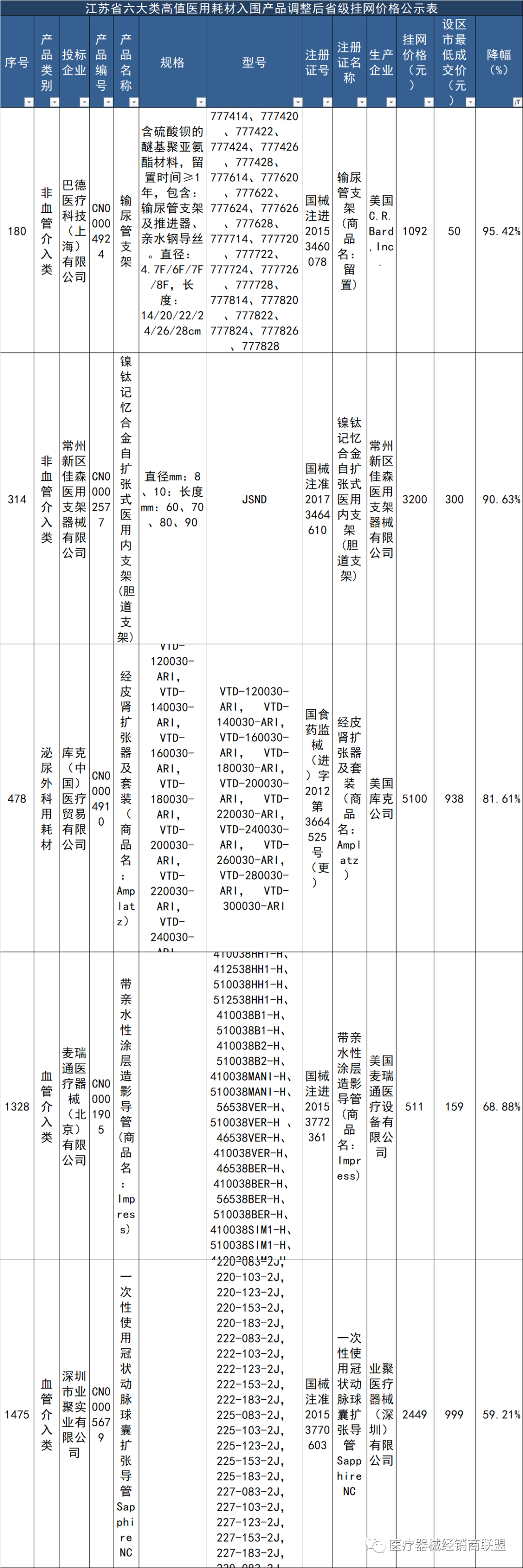 《通知》中,江蘇省對血管介入類、神經外科類、電生理類等六大類高值耗材的省級掛網價格進行了公示。