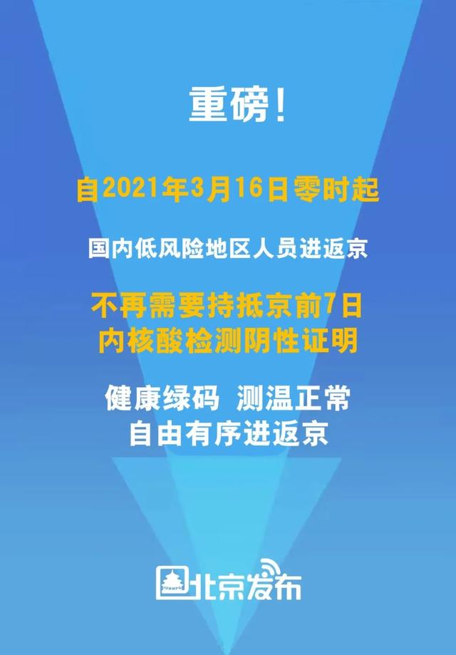 自2021年3月16日零時(shí)起,國內(nèi)低風(fēng)險(xiǎn)地區(qū)人員進(jìn)返京不再需要持抵京前7日內(nèi)核酸檢測(cè)陰性證明,抵京后不再實(shí)行14天健康監(jiān)測(cè),滿7天、滿14天不再進(jìn)行核酸檢測(cè),持健康通行碼“綠碼”,在測(cè)溫正常且做好個(gè)人防護(hù)的前提下可自由有序進(jìn)返京。環(huán)京地區(qū)通勤人員參照以上措施執(zhí)行。