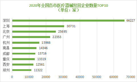 從全國(guó)各市的醫(yī)療器械經(jīng)營(yíng)企業(yè)數(shù)量看,深圳市以66227家領(lǐng)跑全國(guó),上海市以30731家位列第二,北京市以25695家排名三位。其后全國(guó)排名前十的城市分別是廣州市、杭州市、南昌市等城市進(jìn)入全國(guó)前十排行榜。