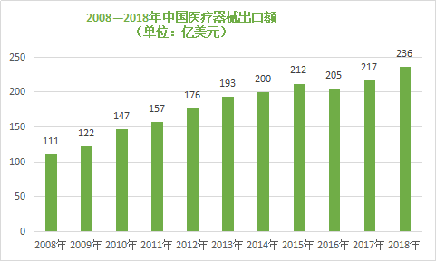同時(shí),國(guó)產(chǎn)醫(yī)療器械在推進(jìn)國(guó)內(nèi)市場(chǎng)進(jìn)口替代的進(jìn)程中,也在積極走向海外市場(chǎng)。從出口額來(lái)看,中國(guó)醫(yī)療器械出口額從 2008 年的 111 億美元提升至 2018 年的 236 億美元,復(fù) 合增速達(dá)到約 8%。中國(guó)醫(yī)療器械在全球已占一席之地。