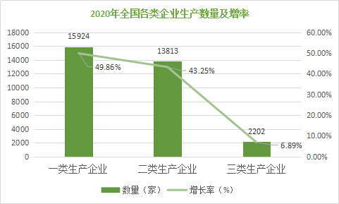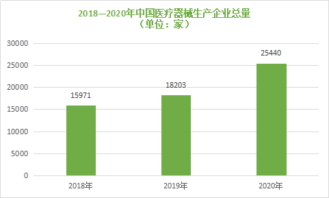 到2020 年底,中國(guó)醫(yī)療器械生產(chǎn)企業(yè)達(dá)25440家,同比增長(zhǎng)39.76%。其中,可生產(chǎn)一類產(chǎn)品的企業(yè)有15924家,占比49.86%;可生產(chǎn)二類產(chǎn)品的企業(yè)13813家,占比43.25% ;可生產(chǎn)Ⅲ類產(chǎn)品的企業(yè)2202家,占比6.89%。