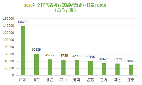 從全國(guó)各省份經(jīng)營(yíng)企業(yè)分布狀況來(lái)看,廣東省以1387702家經(jīng)營(yíng)企業(yè)高舉榜首,山東憑借60929家經(jīng)營(yíng)企業(yè)位居第二,浙江省以45177家經(jīng)營(yíng)企業(yè)排名第三,四川省、河南省、江蘇省等省份進(jìn)入全國(guó)前十排名榜。沿海省域在醫(yī)療器械經(jīng)營(yíng)中占據(jù)相對(duì)優(yōu)勢(shì),四川、河南、江西等內(nèi)陸省份成為醫(yī)療器械產(chǎn)業(yè)轉(zhuǎn)移、升級(jí)的重要區(qū)域。
