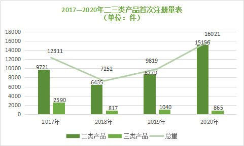 在醫(yī)療器械產(chǎn)品方面,截至2020 年底,全國(guó)有效產(chǎn)品注冊(cè)量達(dá)187062 件,同比增長(zhǎng)24.7%;其中,二類產(chǎn)品首次注冊(cè)量為15156件,三類產(chǎn)品首次注冊(cè)量為865件。