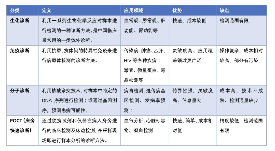 按照檢測原理和應(yīng)用領(lǐng)域,體外診斷可以分為生化診斷、免疫診斷、分子診斷、POCT四種。