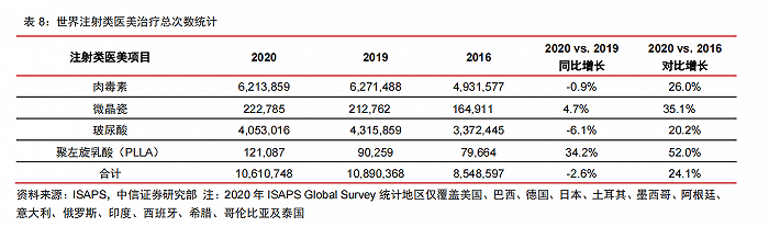 據(jù) ISAPS Global Survey 2020 數(shù)據(jù),在注射類(lèi)醫(yī)美項(xiàng)目中,代表再生醫(yī)美主流項(xiàng)目的PLLA 成為增長(zhǎng)最快的項(xiàng)目。2020 年,ISAPS 統(tǒng)計(jì)全球注射類(lèi)醫(yī)美治療次數(shù)總計(jì) 1061 萬(wàn),同比下滑 2.6%,對(duì)比 2016 年增長(zhǎng) 24.1%。其中,PLLA 醫(yī)美治療總次數(shù)同比增長(zhǎng) 34.2%,對(duì)比 2016 年增長(zhǎng) 52%。微晶瓷治療總次數(shù)同比增長(zhǎng) 4.7%,對(duì)比 2016 年增長(zhǎng) 35.1%。肉毒素、玻尿酸醫(yī)美總次數(shù)分別同比下滑 0.9%、6.1%,對(duì)比 2016 年分別增長(zhǎng) 26%、20.2%。