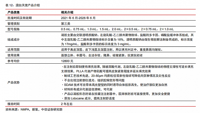 濡白天使是愛(ài)美客旗下含左旋乳酸-乙二醇共聚物(PLLA)微球的交聯(lián)透明質(zhì)酸鈉凝膠,產(chǎn)品于 2021 年 6 月獲 NMPA 批準(zhǔn),有效期至 2026 年 6 月,屬于第三類(lèi)醫(yī)療器械,適用于真皮深層、皮下淺層及深層注射,用以填充糾正中、重度鼻唇溝皺紋。與競(jìng)品相比,濡白天使在產(chǎn)品力、醫(yī)生操作便捷度及用戶(hù)體驗(yàn)方面具備競(jìng)爭(zhēng)優(yōu)勢(shì)。