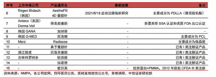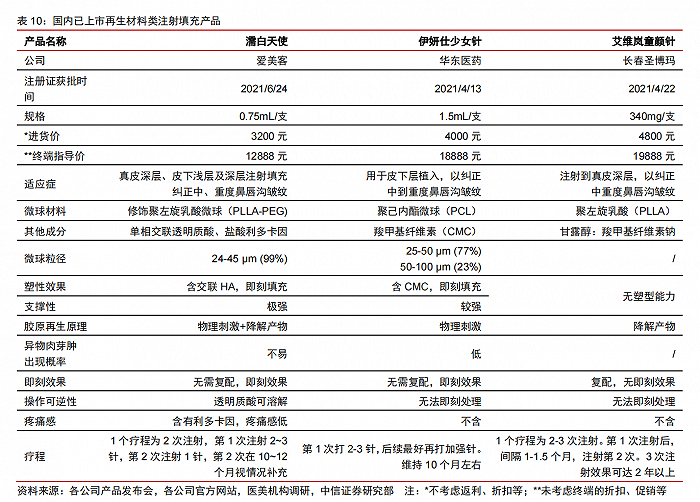 國(guó)內(nèi)已獲批和正在研發(fā)、臨床階段的產(chǎn)品較原研產(chǎn)品有產(chǎn)品、工藝、劑型等多方面的改進(jìn),功能性更完善、安全性提升、操作更便利。2021 年,NMPA 批準(zhǔn)三款刺激膠原蛋白再生類(lèi)的醫(yī)美注射填充產(chǎn)品,為艾維嵐童顏針(長(zhǎng)春圣博瑪)、伊妍仕少女針(S 號(hào))(華東醫(yī)藥)、濡白天使(愛(ài)美客)。