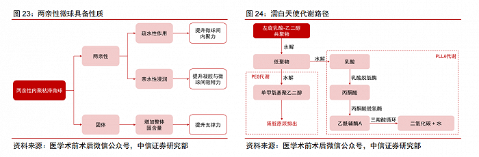愛(ài)美客首次將金標(biāo)準(zhǔn)微球粒徑制備技術(shù)應(yīng)用于 PLLA,膠原再生效率高,避免過(guò)強(qiáng)炎性反應(yīng),阻斷過(guò)分再生誘因。濡白天使使用了雙親性?xún)?nèi)聚粘滯微球,組織融合性更高。
