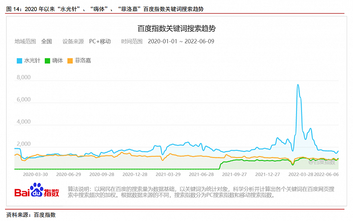 2022 年 3 月,國(guó)家藥監(jiān)局發(fā)布關(guān)于調(diào)整《醫(yī)療器械分類(lèi)目錄》部分內(nèi)容的公告,確定將水光針納入械三分類(lèi)、監(jiān)管加強(qiáng),菲洛嘉市場(chǎng)關(guān)注度有所下降,嗨體市場(chǎng)關(guān)注度大幅提升。