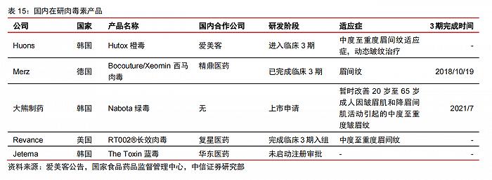 國(guó)內(nèi) 5 款肉毒處于申請(qǐng)階段。包括:Huons 的 Hutox 橙毒、Merz 的西馬肉毒、大熊制藥的 Nabota 綠毒、Revance 的 RT002®長(zhǎng)效肉毒和 Jetema The Toxin 藍(lán)毒。大熊制藥的 Nabota 綠毒進(jìn)度最快已提交上市申請(qǐng),有望成為國(guó)內(nèi)獲得第五張注冊(cè)證的肉毒素產(chǎn)品。此外,愛(ài)美客經(jīng)韓國(guó) Huons Co., Ltd.獨(dú)家授權(quán)在中國(guó)注冊(cè)及商業(yè)化注射用 A 型肉毒毒素在研產(chǎn)品的獨(dú)家權(quán)利,為期十年。目前,愛(ài)美客注射用 A 型肉毒毒素在針對(duì)中度至重度眉間紋適應(yīng)癥方面免于在中國(guó)進(jìn)行 I 期及 II 期臨床試驗(yàn),因此處于臨床 3 期,較落后于 Merz 的西馬肉毒和 Revance 的 RT002®長(zhǎng)效肉毒。Jetema 的 The Toxin 藍(lán)毒進(jìn)度最慢,與華東醫(yī)藥簽署戰(zhàn)略合作,尚未啟動(dòng)注冊(cè)審批。