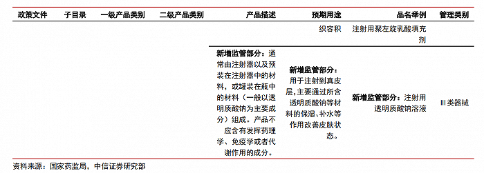 在《醫(yī)療器械分類(lèi)目錄》部分內(nèi)容調(diào)整表中,國(guó)家藥監(jiān)局對(duì)部分醫(yī)美產(chǎn)品監(jiān)管類(lèi)別進(jìn)行了調(diào)整,將保濕、補(bǔ)水作為預(yù)期用途的注射整形美容產(chǎn)品也納入進(jìn)Ⅲ類(lèi)醫(yī)療器械進(jìn)行監(jiān)管,而在藥監(jiān)局 2017 年《醫(yī)療器械分類(lèi)目錄》中只有預(yù)期用途為增加組織容積才按照Ⅲ類(lèi)醫(yī)療器械進(jìn)行監(jiān)管。