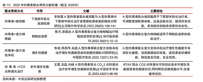 肉毒素聯(lián)合用藥場(chǎng)景豐富,擁有較大潛在空間。目前肉毒素聯(lián)合項(xiàng)目主要有:(1)肉毒素+玻尿酸。肉毒素只能改善動(dòng)態(tài)紋,玻尿酸填充可以改善靜態(tài)紋,二者相得映彰。(2)肉毒素+光電項(xiàng)目。光電項(xiàng)目具有刺激膠原蛋白再生的功效,先注射肉毒素可以使肌膚更加光滑,光電能量更加均勻地進(jìn)入肌膚,透明質(zhì)酸流失更少。(3)肉毒素+中胚層療法。中胚層療法將營(yíng)養(yǎng)物質(zhì)注射到皮下組織改善肌膚,如水光針。肉毒素起到短期去除皺紋的功效,中胚層療法可以防止皺紋再次發(fā)生。(4)肉毒素+藥物及激光治療。肉毒素具有抑制成纖維細(xì)胞增殖和瘢痕增生的效果,聯(lián)合脈沖染料激光可以改善疤痕的毛細(xì)血管擴(kuò)張和充血潮紅,聯(lián)合二氧化碳點(diǎn)陣激光可以刺激表皮和真皮再生重建,還可以聯(lián)合淺層放療降低疤痕的復(fù)發(fā)率。