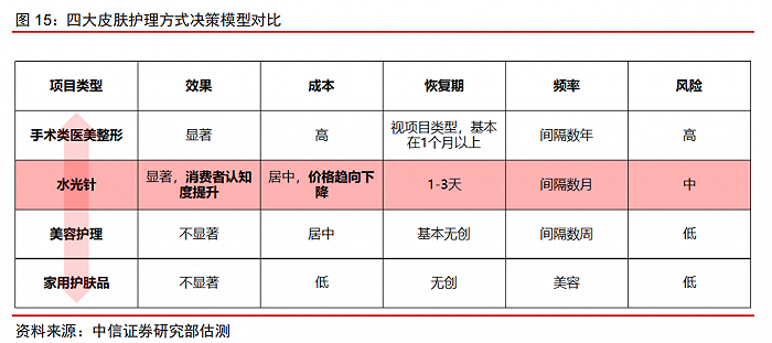 ②水光針屬于效果顯著的護(hù)膚方式,且隨著消費(fèi)者認(rèn)知度提升,水光針有望受到更大消費(fèi)群體的認(rèn)可,且其成本居中、價(jià)格趨勢(shì)向下。美容護(hù)理、家用護(hù)膚品等品類(lèi)體現(xiàn)皮膚護(hù)理市場(chǎng)需求旺盛,水光針具有潛在滲透空間。