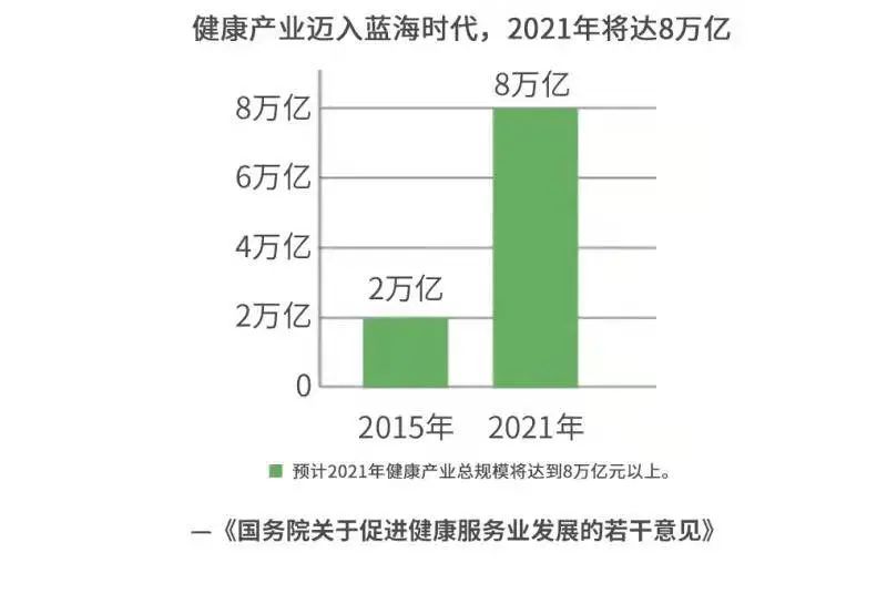 據(jù)新華社報(bào)道:中國(guó)將成為全球健康產(chǎn)業(yè)的最大市場(chǎng)。而且“健康中國(guó)”戰(zhàn)略明確指出:到2030年,健康服務(wù)業(yè)總規(guī)模將達(dá)到16萬(wàn)億?,F(xiàn)階段的市場(chǎng)規(guī)模據(jù)這個(gè)發(fā)展目標(biāo)尚存在十幾萬(wàn)億的發(fā)展空間,這也就意味著大健康產(chǎn)業(yè)將迎來(lái)黃金時(shí)期!