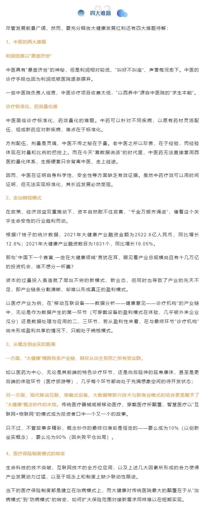 無獨(dú)有偶,2022年4月27日,國務(wù)院辦公廳印發(fā)《“十四五”國民健康規(guī)劃》,圍繞人口老齡化趨勢(shì)以及健康中國發(fā)展戰(zhàn)略,將從預(yù)防、診斷、治療三個(gè)層次,推動(dòng)醫(yī)療健康產(chǎn)業(yè)的發(fā)展。
