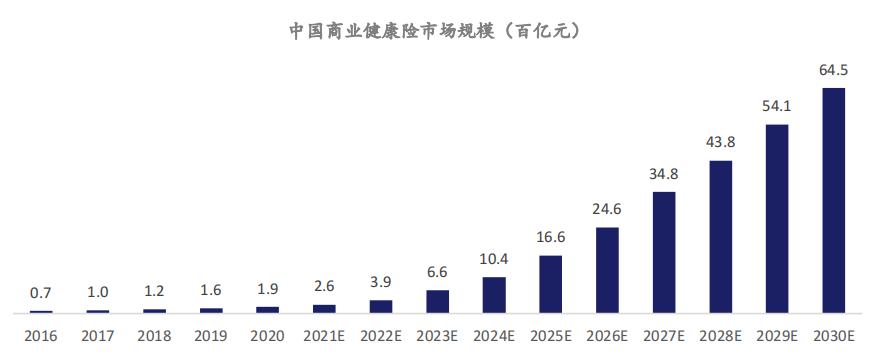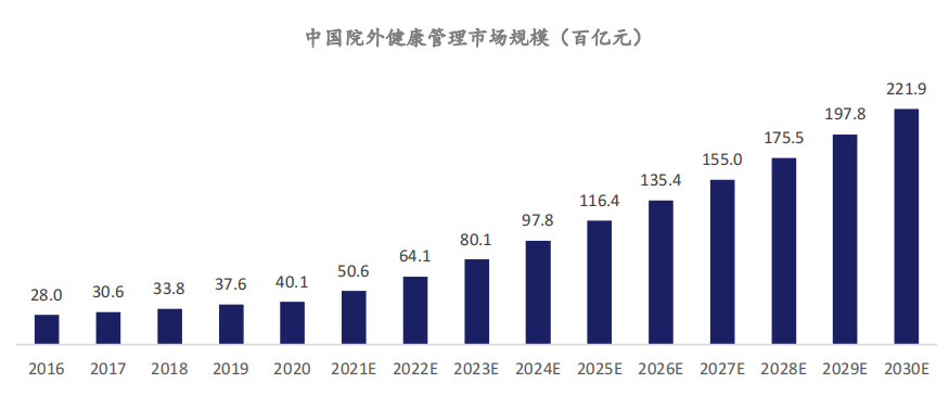 根據(jù)數(shù)據(jù)統(tǒng)計,院外健康管理市場規(guī)模預(yù)計 2030 年將達(dá)到 22,193 億元,商業(yè)健康險市場預(yù)計 2030 年將達(dá)到 6,451 億元。