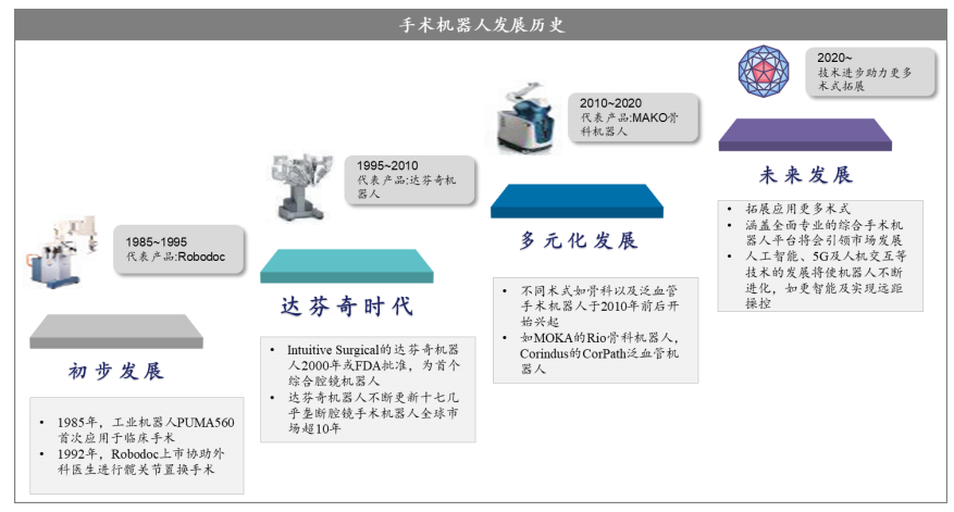 手術(shù)機(jī)器人未來具備巨大的應(yīng)用潛力。當(dāng)前按照臨床應(yīng)用角度可以分為 1)腔鏡手術(shù)機(jī)器人 2)骨科手術(shù)機(jī)器人 3)泛血管手術(shù)機(jī)器人 4)經(jīng)自然腔道手術(shù)機(jī)器人 5)經(jīng)皮穿刺手術(shù)機(jī)器人 6)其他手術(shù)機(jī)器人等六大類別。目前腔鏡手術(shù)機(jī)器人發(fā)展最為成熟,其在普外、泌尿、婦科等多個領(lǐng)域不斷拓展,骨科、泛血管等手術(shù)機(jī)器人也在迅猛發(fā)展,逐步走向成熟階段。