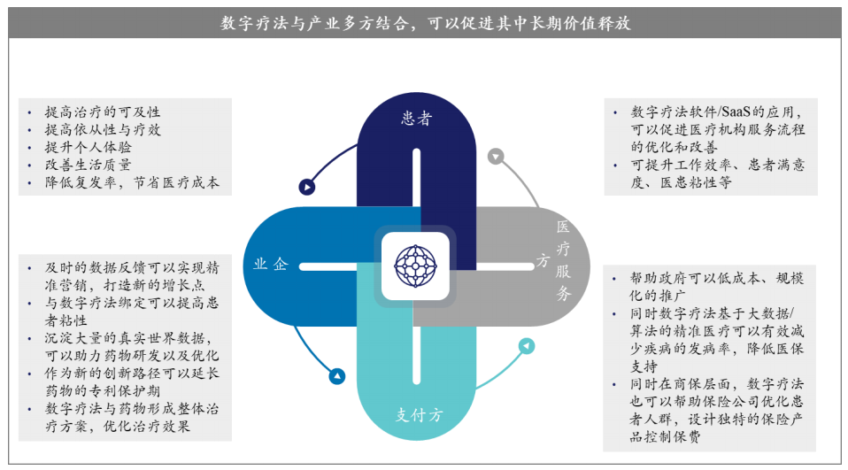 關(guān)于未來的發(fā)展趨勢,藍(lán)皮書指出,數(shù)字療法將在慢病及精神類疾病領(lǐng)域迎來高速發(fā)展,手機(jī)、可穿戴設(shè)備等移動終端的持續(xù)發(fā)展與普及將為數(shù)字療法的爆發(fā)提供基礎(chǔ),使其能夠無縫滲透以及連接人們?nèi)鞒痰慕】祱鼍?,包括健康管理、疾病的預(yù)防、治療以及術(shù)后康復(fù)等等。數(shù)字療法企業(yè)還面臨著諸多問題,如商業(yè)化、支付機(jī)制、依從性等問題,所以數(shù)字療法融合現(xiàn)有治療方式將成為新的發(fā)展方向。目前資本端、學(xué)術(shù)界以及醫(yī)療產(chǎn)業(yè)界都持續(xù)下注數(shù)字療法,臨床研究大幅增長,價值正在逐步釋放,未來商業(yè)化將逐漸清晰。