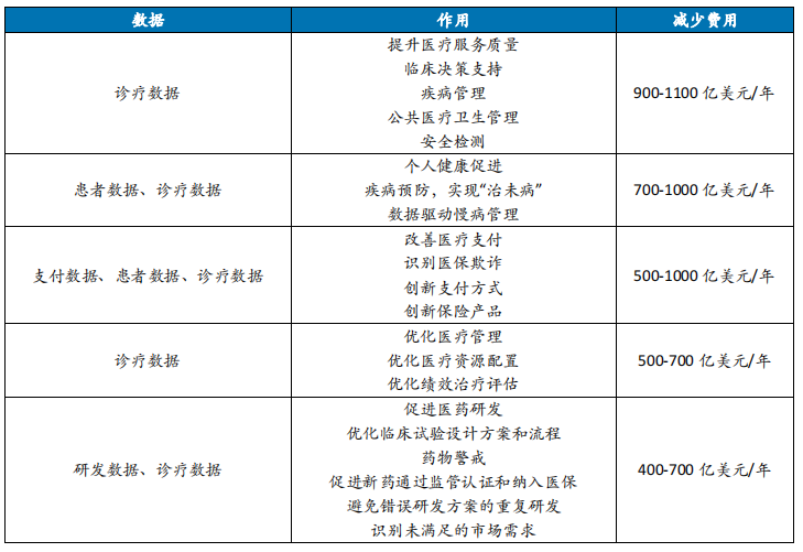 麥肯錫在 2013 年報告中預(yù)測僅在美國,醫(yī)療大數(shù)據(jù)的應(yīng)用有望減少 3,000-4,500 億美元/年的醫(yī)療費(fèi)用。我國存在人口基數(shù)巨大、醫(yī)療資源浪費(fèi)嚴(yán)重、醫(yī)療資源緊缺和配置不合理、醫(yī)療支出增長過快、商保發(fā)展乏力等問題,醫(yī)療大數(shù)據(jù)的可應(yīng)用場景豐富且能深度挖掘,我國醫(yī)療大數(shù)據(jù)的市場規(guī)模至少在千億級。
