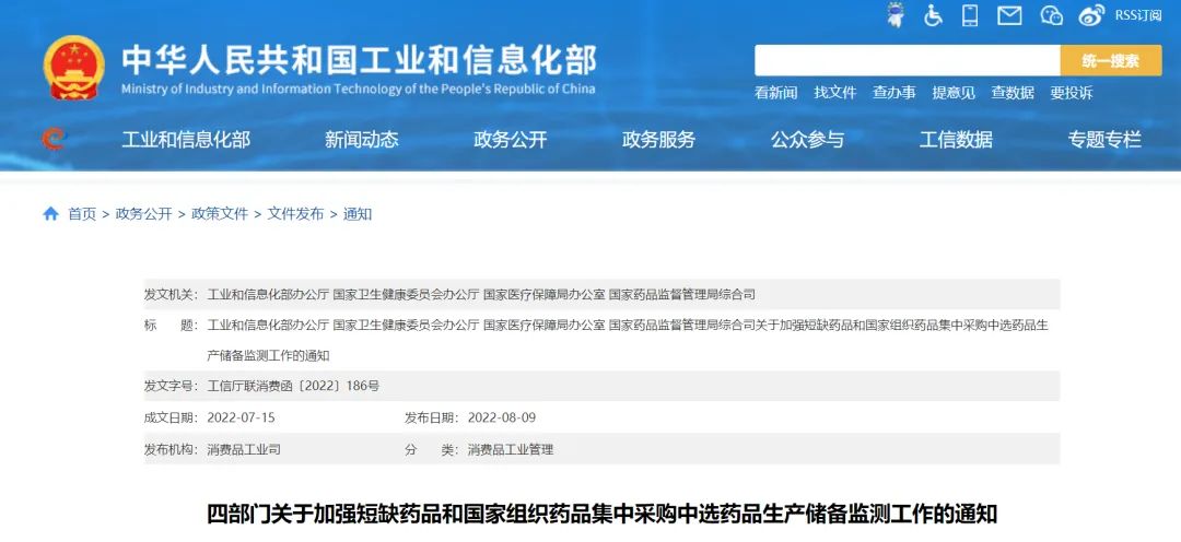 8月9日,工業(yè)和信息化部辦公廳、國家衛(wèi)生健康委員會辦公廳、國家醫(yī)療保障局辦公室、國家藥品監(jiān)督管理局綜合司發(fā)布《四部門關(guān)于加強短缺藥品和國家組織藥品集中采購中選藥品生產(chǎn)儲備監(jiān)測工作的通知》(一下簡稱《通知》)。
