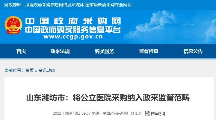 據(jù)中國政府采購網(wǎng)消息,日前,山東省濰坊市財政局印發(fā)《關于進一步規(guī)范和加強公立醫(yī)院政府采購監(jiān)督管理工作的通知》(以下簡稱《通知》),明確將轄區(qū)內(nèi)公立醫(yī)院的政府采購活動全部納入政府采購監(jiān)管范疇。