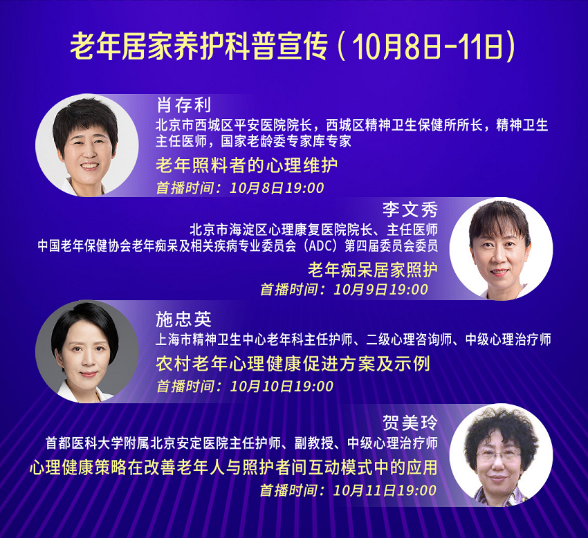 據(jù)悉,本屆關(guān)愛老年心理健康進(jìn)社區(qū)活動(dòng)月,從9月21日阿爾茲海默癥日開始,持續(xù)至10月下旬,主要內(nèi)容涵蓋老年精神與心理健康科普宣傳和關(guān)愛老年心理健康優(yōu)秀短視頻作品展映等兩個(gè)方面??破招麄鞴卜譃?ldquo;老年腦認(rèn)知健康”、“老年情緒社會(huì)健康”、“老年居家養(yǎng)護(hù)”、“老年戶外運(yùn)動(dòng)”四個(gè)專題,分別由16名國內(nèi)知名專家,通過國家心理健康中心官網(wǎng)、人民號(hào)“健心有我”、快手“健心有我”、西瓜視頻“健心有我”等平臺(tái)進(jìn)行宣講;優(yōu)秀短視頻展映則由專業(yè)機(jī)構(gòu)推選10-30部作品,在相關(guān)平臺(tái)和社區(qū)展出。