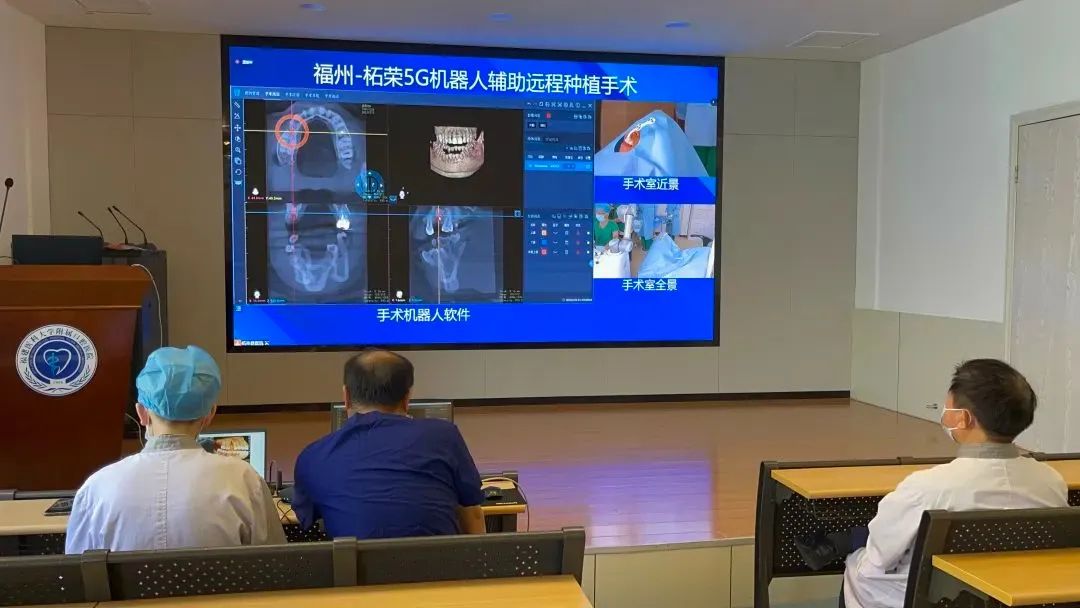 在福州,借助實時傳回的視頻畫面及軟件界面的指示,觀察每一鉆備洞精度,遠程確認手術(shù)規(guī)劃無誤后,由陳江教授在5G網(wǎng)絡(luò)輔助下,遠程操作遠在柘榮縣醫(yī)院手術(shù)室中的口腔種植機器人系統(tǒng),準確定位、打孔、鉆洞、種植牙齒等操作均由機械臂按照規(guī)劃路徑在患者口腔內(nèi)自動游走,直至完成專家認可的手術(shù)規(guī)劃。
