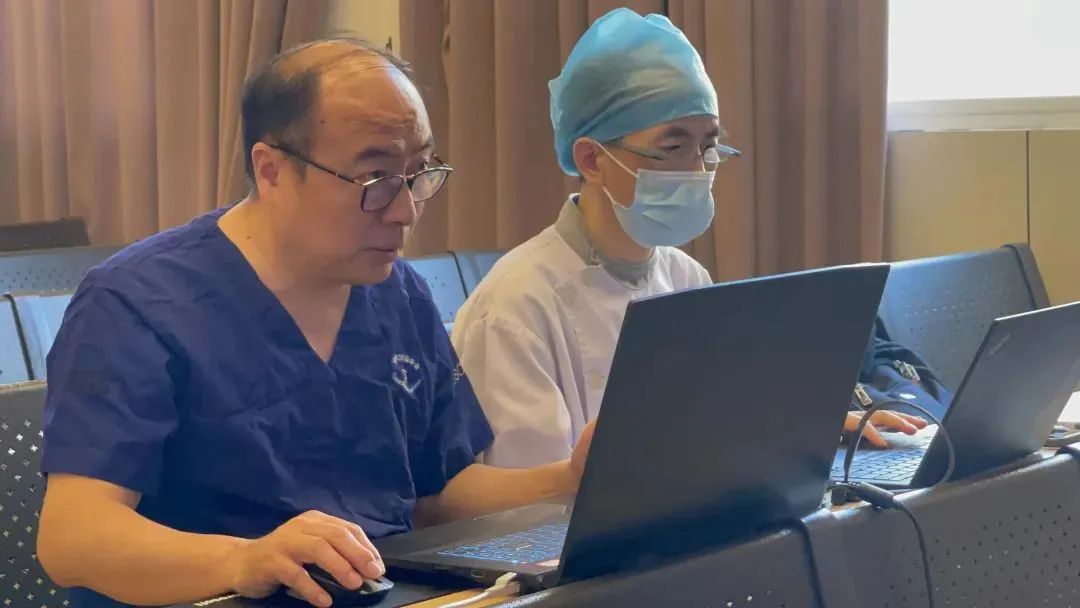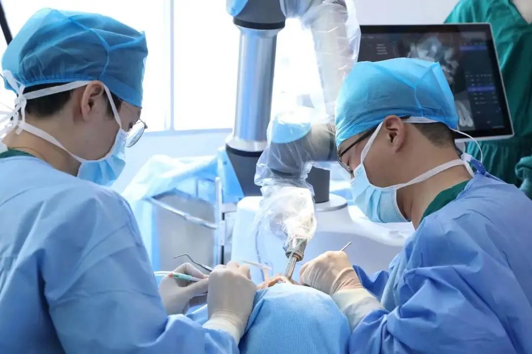 術(shù)前,福建醫(yī)科大學附屬口腔醫(yī)院陳江教授種植牙專家團隊利用機器人軟件完成術(shù)前規(guī)劃制定。 手術(shù)當天,在柘榮縣醫(yī)院口腔科醫(yī)師們?yōu)榛颊邔嵤┫?、適時更換鉆頭等人工操作。