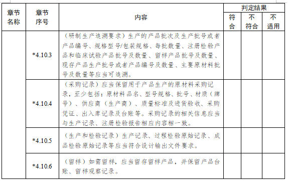 4.10.3(研制生產(chǎn)追溯要求) 生產(chǎn)的產(chǎn)品批次及生產(chǎn)批號(hào)或者產(chǎn)品編號(hào)、規(guī)格型號(hào)/包裝規(guī)格、每批數(shù)量、注冊(cè)檢驗(yàn)產(chǎn)品和臨床試驗(yàn)產(chǎn)品批號(hào)及數(shù)量、留樣產(chǎn)品批號(hào)及數(shù)量、現(xiàn)存產(chǎn)品生產(chǎn)批號(hào)或者產(chǎn)品編號(hào)及數(shù)量、主要原材料批號(hào)及數(shù)量等應(yīng)當(dāng)可追溯。