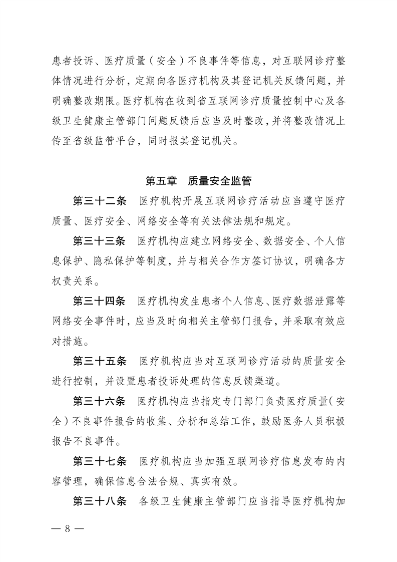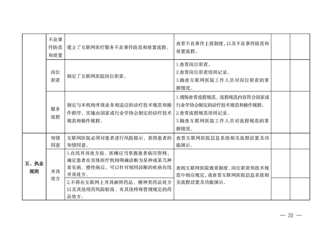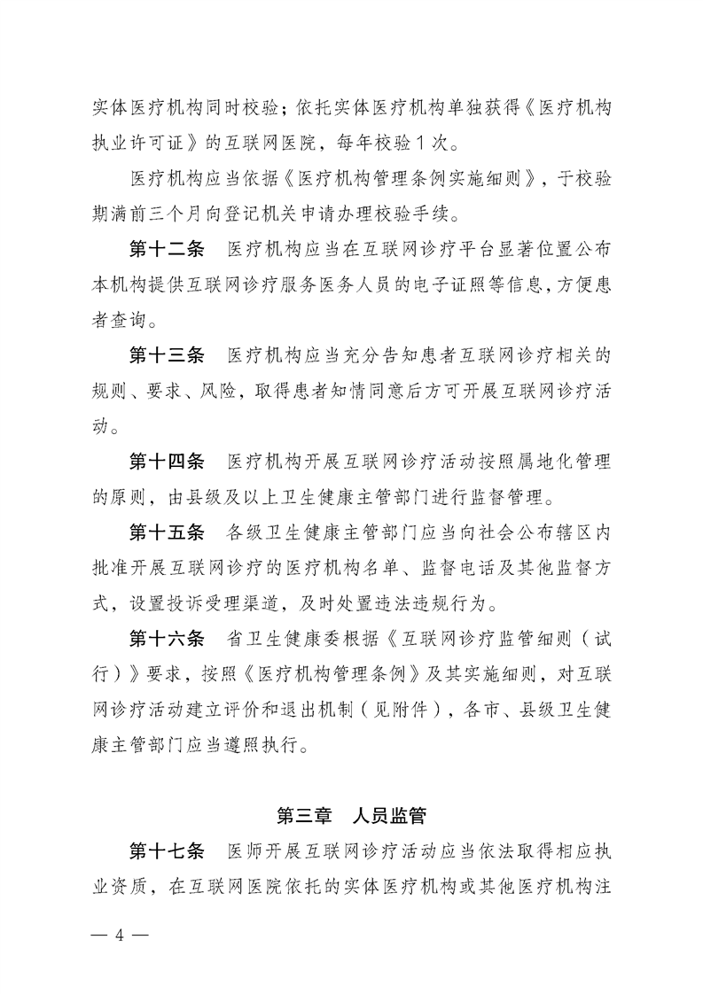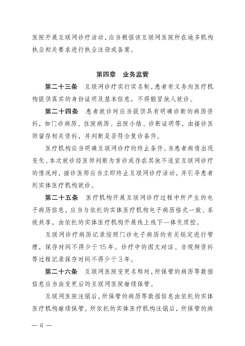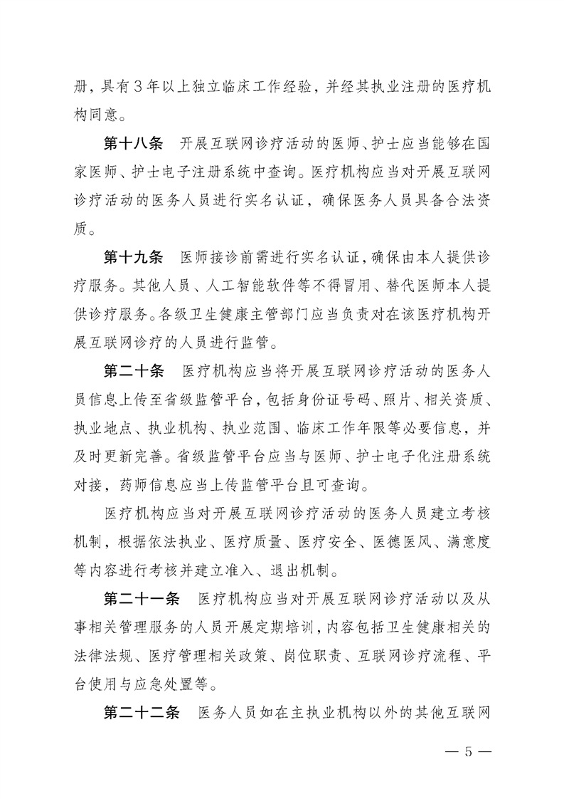 醫(yī)療機(jī)構(gòu)應(yīng)當(dāng)對(duì)開展互聯(lián)網(wǎng)診療活動(dòng)的醫(yī)務(wù)人員建立考核機(jī)制,根據(jù)依法執(zhí)業(yè)、醫(yī)療質(zhì)量、醫(yī)療安全、醫(yī)德醫(yī)風(fēng)、滿意度等內(nèi)容進(jìn)行考核并建立準(zhǔn)入、退出機(jī)制。