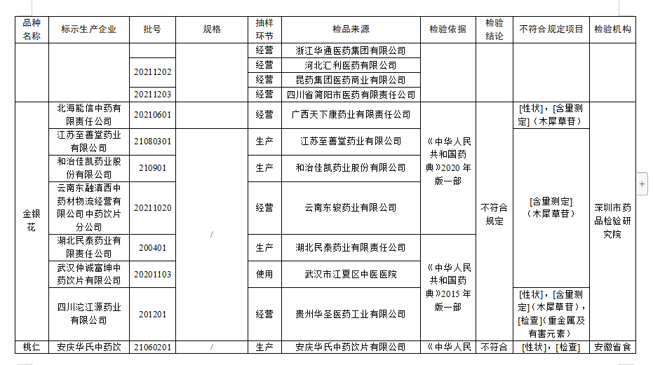 經深圳市藥品檢驗研究院檢驗,標示為江蘇至善堂藥業(yè)有限公司、和治佳凱藥業(yè)股份有限公司、湖北民泰藥業(yè)有限責任公司、武漢仲誠富坤中藥飲片有限公司、北海能信中藥有限責任公司、四川沱江源藥業(yè)有限公司、云南東融滇西中藥材物流經營有限公司中藥飲片分公司生產的7批次金銀花不符合規(guī)定,不符合規(guī)定項目包括含量測定、性狀、重金屬及有害元素。