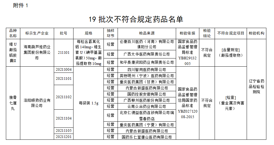 一、經遼寧省藥品檢驗檢測院檢驗,標示為海南葫蘆娃藥業(yè)集團股份有限公司生產的1批次維U顛茄鋁膠囊Ⅱ不符合規(guī)定,不符合規(guī)定項目為含量測定。