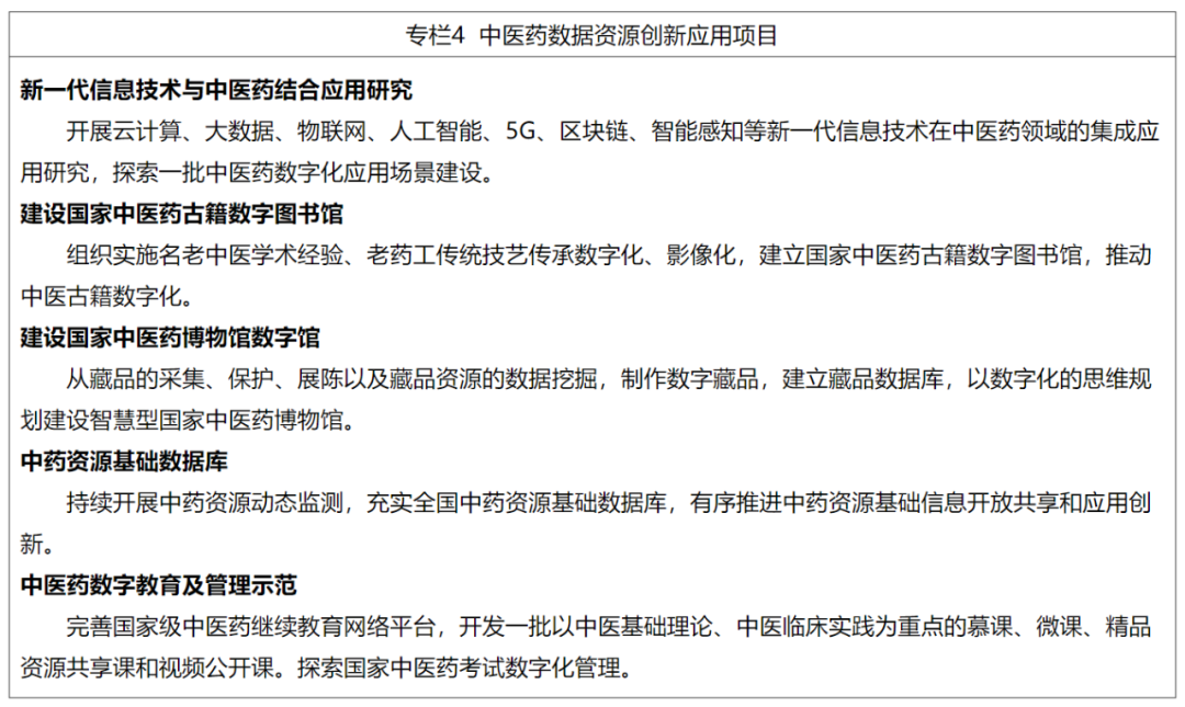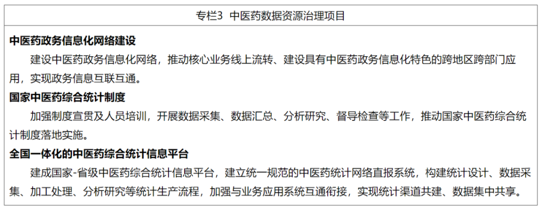 (三)主要任務(wù)。圍繞中醫(yī)藥信息化高質(zhì)量發(fā)展目標(biāo),主要部署了四個(gè)方面的任務(wù)。一是夯實(shí)中醫(yī)藥信息化發(fā)展基礎(chǔ),提出加快信息基礎(chǔ)設(shè)施提檔升級(jí)、強(qiáng)化網(wǎng)絡(luò)和數(shù)據(jù)安全防護(hù)、推進(jìn)中醫(yī)藥信息標(biāo)準(zhǔn)應(yīng)用3個(gè)方面具體措施。二是深化數(shù)字便民惠民服務(wù),提出加強(qiáng)中醫(yī)醫(yī)院智慧化建設(shè)、推動(dòng)中醫(yī)藥健康服務(wù)與互聯(lián)網(wǎng)深度融合、優(yōu)化中醫(yī)館健康信息平臺(tái)、做優(yōu)智慧中醫(yī)醫(yī)聯(lián)體4個(gè)方面具體措施。三是加強(qiáng)中醫(yī)藥數(shù)據(jù)資源治理,提出強(qiáng)化中醫(yī)藥政務(wù)服務(wù)和管理、實(shí)施國(guó)家中醫(yī)藥綜合統(tǒng)計(jì)制度、建設(shè)中醫(yī)藥綜合統(tǒng)計(jì)信息平臺(tái)、推動(dòng)中醫(yī)藥統(tǒng)計(jì)數(shù)據(jù)開(kāi)放共享4個(gè)方面具體措施。四是推進(jìn)中醫(yī)藥數(shù)據(jù)資源創(chuàng)新應(yīng)用,提出加快中醫(yī)藥關(guān)鍵數(shù)字技術(shù)攻關(guān)、助力中藥質(zhì)量控制水平提升、創(chuàng)新中醫(yī)藥數(shù)字教育新模式、推動(dòng)中醫(yī)藥文化數(shù)字化建設(shè)4個(gè)方面具體措施。同時(shí),在四大任務(wù)下設(shè)立4個(gè)信息化項(xiàng)目專欄,共14個(gè)項(xiàng)目,全面支撐任務(wù)的具體部署、實(shí)施和落地。