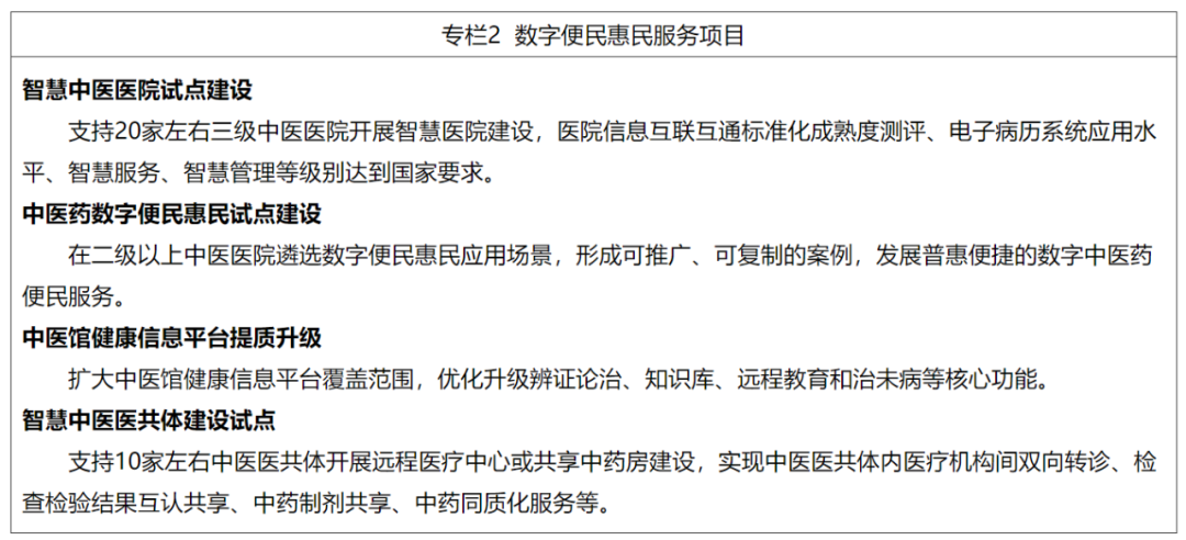規(guī)劃明確,支持20家左右三級(jí)中醫(yī)醫(yī)院開(kāi)展智慧醫(yī)院建設(shè);在二級(jí)以上中醫(yī)醫(yī)院遴選數(shù)字便民惠民應(yīng)用場(chǎng)景;擴(kuò)大中醫(yī)館健康信息平臺(tái)覆蓋范圍;支持10家左右中醫(yī)醫(yī)共體開(kāi)展遠(yuǎn)程醫(yī)療中心或共享中藥房建設(shè)。