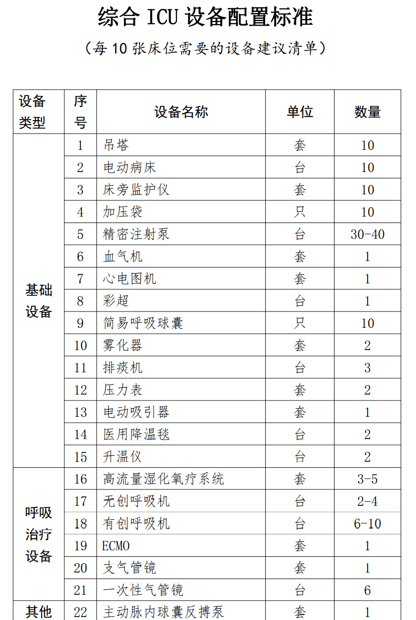 以綜合ICU為例,按照國家衛(wèi)健委所發(fā)布的配置標(biāo)準(zhǔn),每10張綜合ICU床位需要配置包括:彩超、心電圖機(jī)、床旁監(jiān)護(hù)儀10套、呼吸機(jī)8-14臺(tái)等34種醫(yī)療設(shè)備。