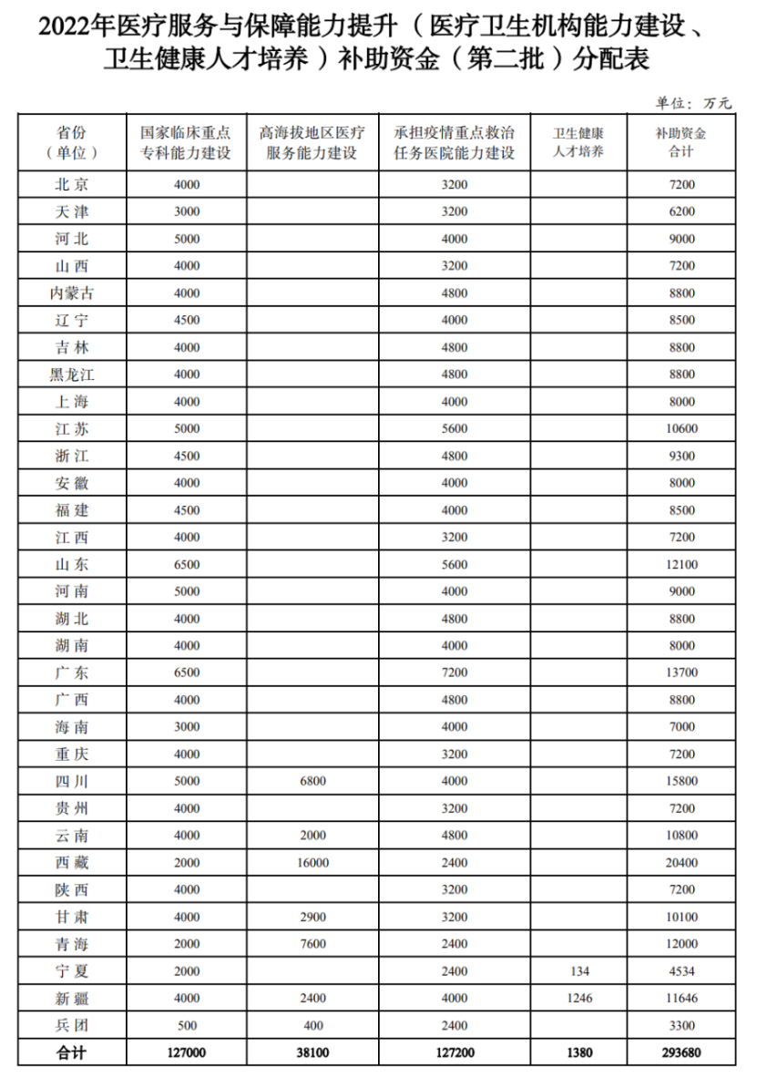 根據(jù)文件數(shù)據(jù),下達(dá)2022年醫(yī)療服務(wù)與保障能力提升(醫(yī)療衛(wèi)生機(jī)構(gòu)能力建設(shè)、衛(wèi)生健康人才培養(yǎng))補(bǔ)助資金(第二批)用于支持國家臨床重點(diǎn)??平ㄔO(shè)、高海拔地區(qū)醫(yī)療服務(wù)能力建設(shè)、承擔(dān)疫情重點(diǎn)救治任務(wù)醫(yī)院能力建設(shè)以及衛(wèi)生健康人才培養(yǎng)補(bǔ)助,合計(jì)29.3億余元。