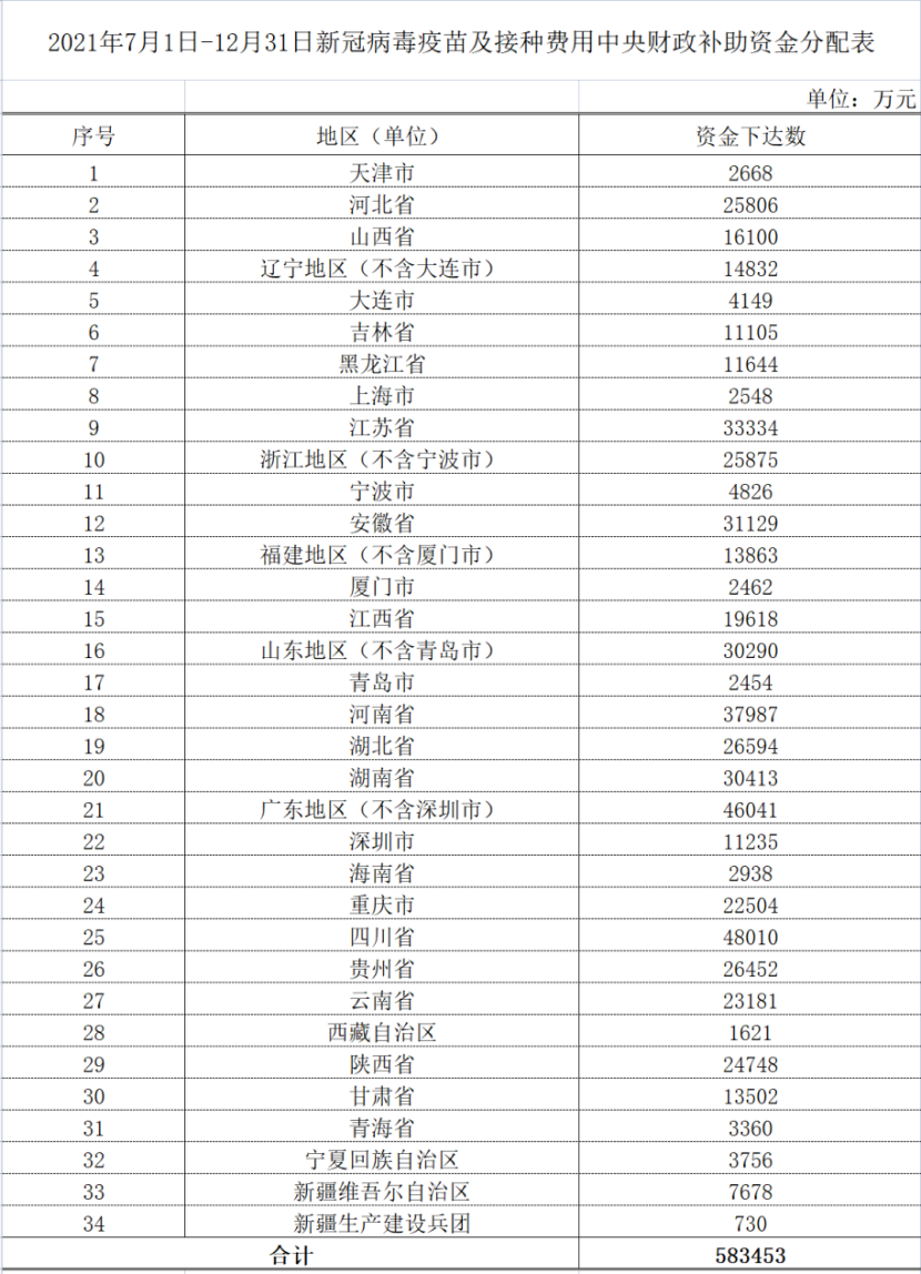 下達(dá)2022年新冠病毒疫苗及接種費(fèi)用中央財(cái)政補(bǔ)助資金(第一批)58.3億余元。2022年重大傳染病防控經(jīng)費(fèi)合計(jì)203.7億余元,提前下達(dá)156.4億余元,此次下達(dá)47.3億余元。