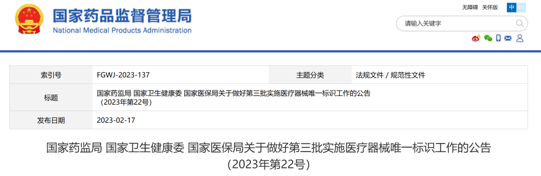 關(guān)于做好第三批實施醫(yī)療器械唯一標識工作的公告