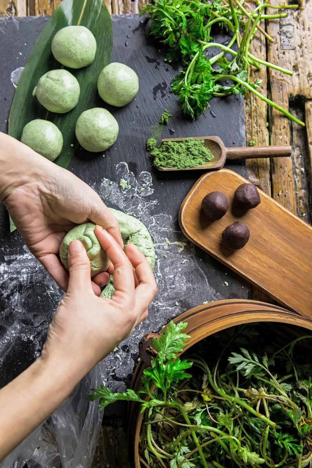 清明時(shí)節(jié),江南一帶有吃青團(tuán)子的風(fēng)俗習(xí)慣。青團(tuán)子是用一種名叫“漿麥草”的野生植物搗爛后擠壓出汁,接著取用這種汁同晾干后的水磨純糯米粉拌勻揉和,然后開始制作團(tuán)子。