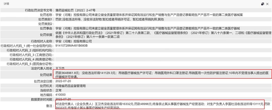 無(wú)獨(dú)有偶,去年7月,河南省藥品監(jiān)督管理局發(fā)布了一則處罰通知,宇安(河南)控股有限公司因體系不合規(guī)被罰款364萬(wàn)元,同時(shí),械企法人、負(fù)責(zé)人還被罰終身禁止從事醫(yī)療器械生產(chǎn)經(jīng)營(yíng)活動(dòng)。