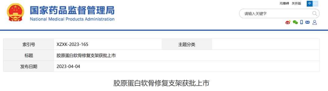 國家藥品監(jiān)督管理局經(jīng)審查,批準了韓國Ubiosis Co., Ltd(優(yōu)拜奧斯)生產(chǎn)的創(chuàng)新產(chǎn)品“膠原蛋白軟骨修復(fù)支架”進口注冊申請。