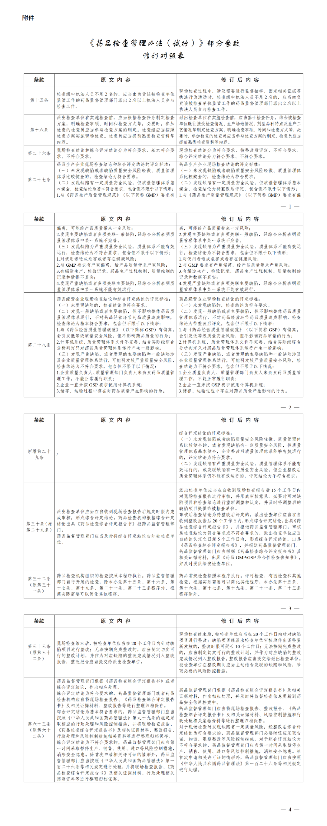 附件:《藥品檢查管理辦法(試行)》部分條款修訂對照表